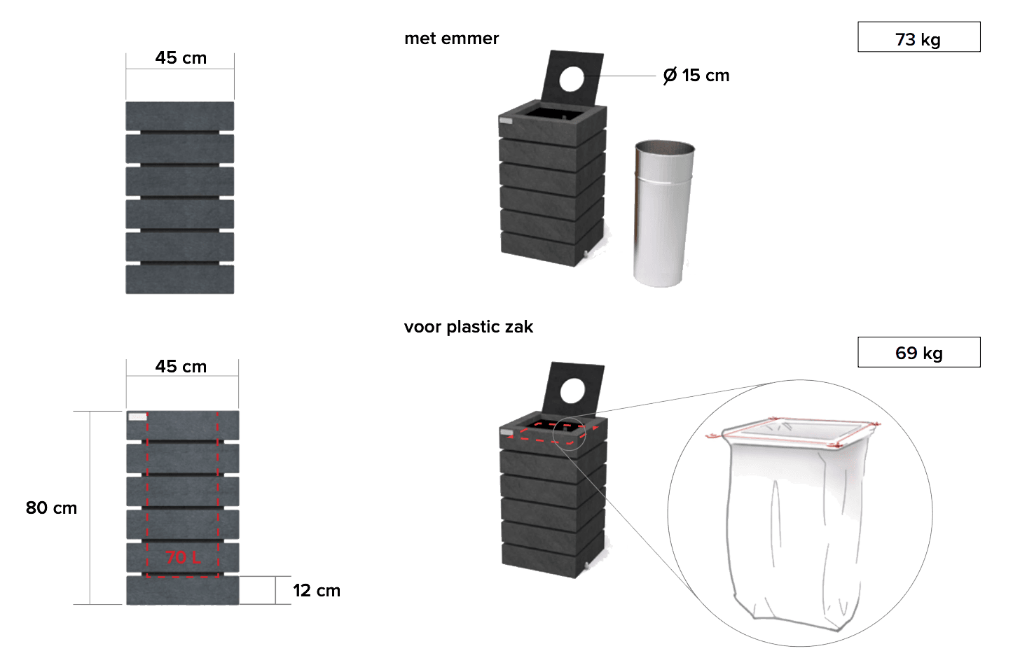 Met een inhoud van 70 liter biedt de Agora afvalbak voldoende capaciteit om grote hoeveelheden afval op te vangen. Dit maakt het de perfecte keuze voor drukke openbare ruimtes waar afvalbeheer een uitdaging kan zijn. De ruime opening zorgt ervoor dat afval gemakkelijk en snel kan worden weggegooid.